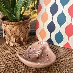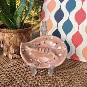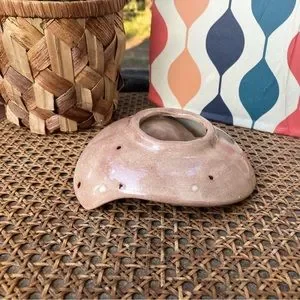 Make a statement with this beautiful beautiful MCM boomerang/paisley-shaped ceramic ashtray! It has a cool earth-tone retro look to it with a light brown glaze throughout and white and deep dark brown polka dots all over. It has the 70s vibes in spade!! Excellent condition!!