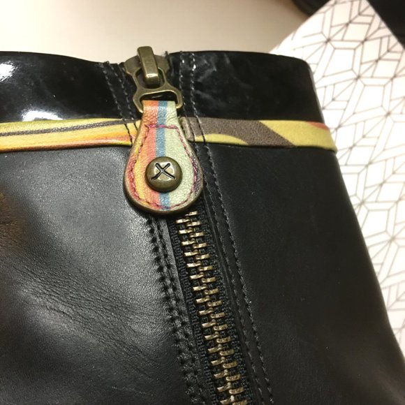 Beautiful Zip-close Ankle boots with a branded zipper pull. Sweet swirl detail in the Paul Smith Signature Stripe with bow, patent leather toe and top detail. Very sassy style!!!