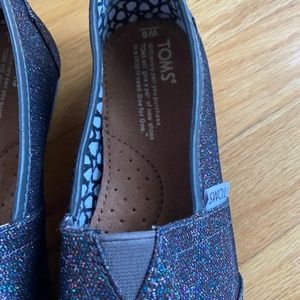 Barely worn Toms metallic glitter espadrilles. Silver with rainbow colors - goes with everything! Excellent gently worn condition with no damage.
