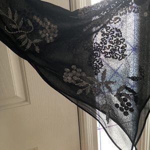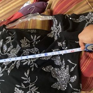 Beautiful black top evening wear, with intricate beading and stones; long elegant l flowy sleeves . Body is fully lined. Sleeves sheer. Shoulder to hem 27 inch and armpit to armpit 17inch. Pet and smoke free home
