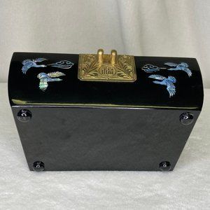 3) Rectangular, high-gloss black lacquer jewelry box inlaid with beautiful iridescent mother-of-pearl. Peaceful scene depicts house with waterwheel, trees and bamboo, mountains and clouds, ducks flying and floating by on the water. Mirrored, hinged lid and lockable closure (lock not included). At least 40 years old. Very good used condition; some minor scratches and scuffs, most unnoticeable except for a scratch and wear on the lower-left corner of lid (see last pic) and chips inside. Top tray lifts out. Red fabric pieces (ring holder, bracelet holder, box liner) are not glued in. Interior smells a bit like incense or potpourri. Approx. 7" W x 5" L X 3.75" D