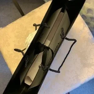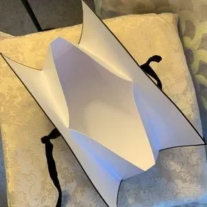 Chanel gift bag insert with ribbon ties and frog mouth folded opening.