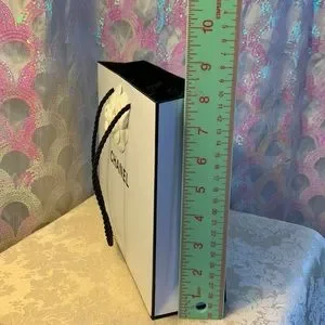 Chanel branded retail bag with signature paper rosette measures 10”x2-3/4”x8” with corded handles.