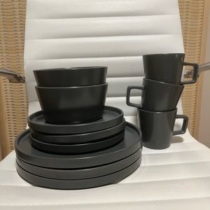 Stone + Lane Black Matte Celina Stoneware Partial Set. Includes three mugs, three 8-inch plates, three 10-inch dinner plates, and two 6-inch bowls. Excellent condition. Originally $64.95, selling for $40. Dishwasher & microwave safe.