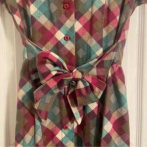 VTG midi handmade teal/purple/pinkish dress. Ties at waist. All buttons present. A couple of stains on the shoulder. Wear around one of the buttons. Precious on.
