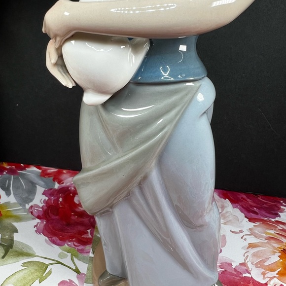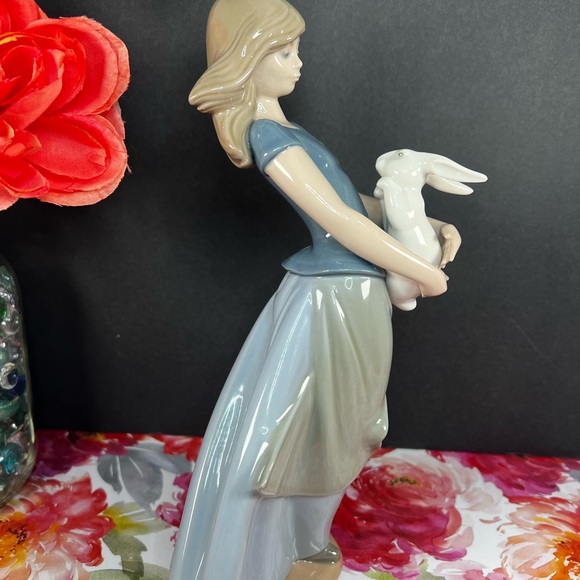 This beautiful NAO by Lladro figurine depicts a pretty young girl holding a cute bunny rabbit. The delicate porcelain craftsmanship is evident in the intricate details of the figurine, which was made in Spain in 1980. The item measures 10.5