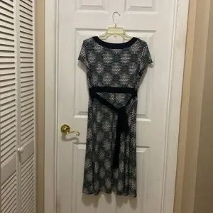 Dress barn Polka Dot Dress: 41” long , V-Neck ,Short sleeves, 95% Polyester and 5% Spandex. Multi colorsBlack, Pink, and lt. green
