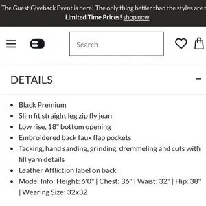 Black premium registered trademark silver cross hardware (button, grommets, etc). Slim fit straight leg zip fly jean. Low rise, 18" bottom opening. Embroidered back faux flap pockets. Tacking, hand sanding, grinding, dremmeling and cuts with fill yarn details. White leather Affliction label on back (minor rubbing; please see photo)