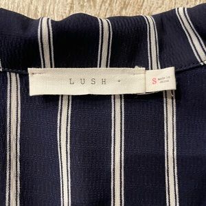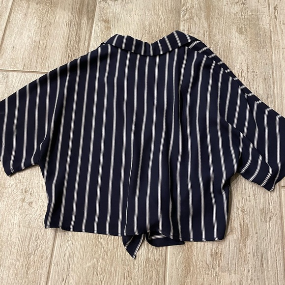 Brand new without tags, navy blue and white striped, button down, has a tie at the bottom