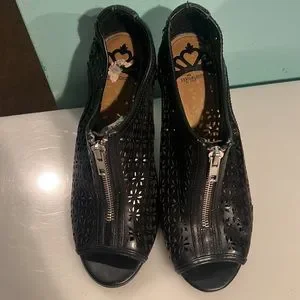 Black leather cutout zip front sandals. Never worn, great condition, like new
