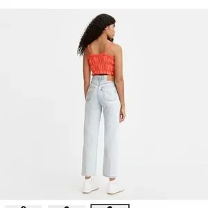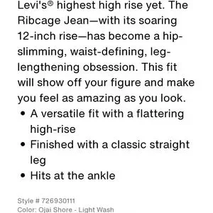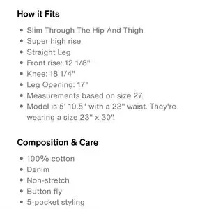 Color is Ojai Shore Loght wash. High waisted. Sizing is 29 Waist, 27 Length. Excellent condition. They are too large on me, but I love the fit, and I sized down. The last 2 pictures are screenshots of Influencers for style/fit. The first 3 pictures are true color.