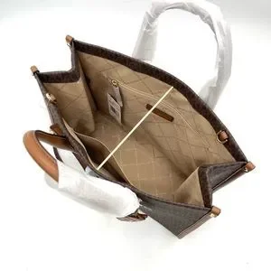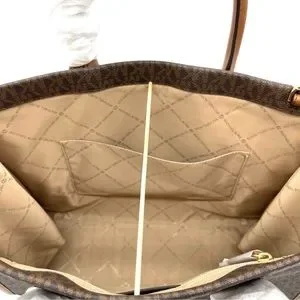 MK signature logo PVC coated canvas body and Saffiano leather inside.