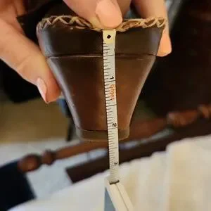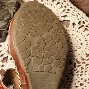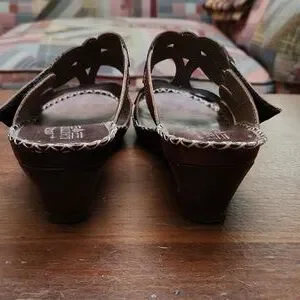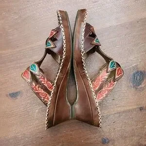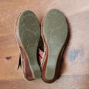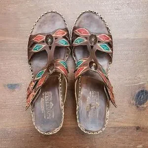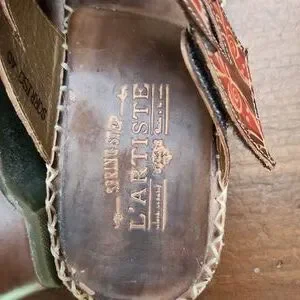 L'ARTISTE sandals. Brown with turquoise and red accents. Velcro closure. Gently used. Only worn a couple of times. Size 40 UK which is about a 9 US. The heel is about 2 and 1/4 in high.