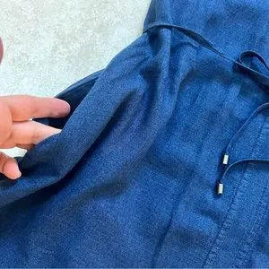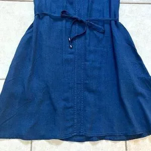 “A breezy denim styled dress with a sleek V-neckline and cute tied waist is great for summer styling.”