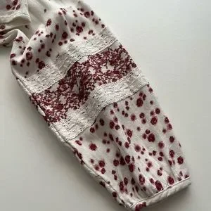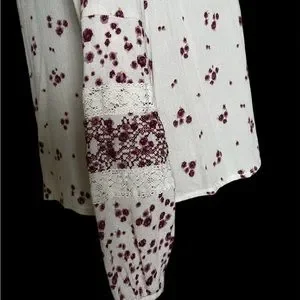 Knox Rose white blouse features maroon embroidery and lace sleeves, blending boho elegance and casual comfort. Ideal for everyday wear or layering.