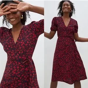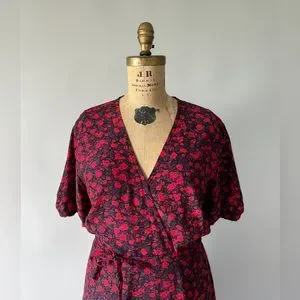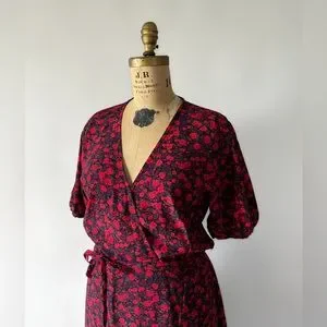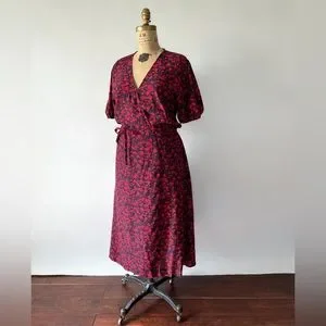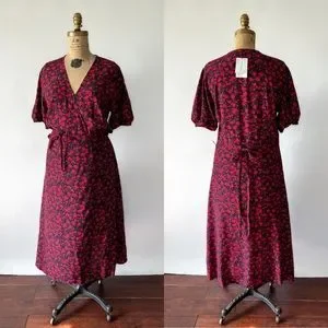 Beautiful NWT red and purple dark floral rayon wrap dress by Faithfull The Brand. It is tagged US 10 / XL. This is the Sumaia dress in Uma Floral. It is a true wrap dress with an attached waist tie that threads through an opening at one side and then ties to the waist tie on the other side to secure the waist, as well as a hook and eye to secure the neckline.