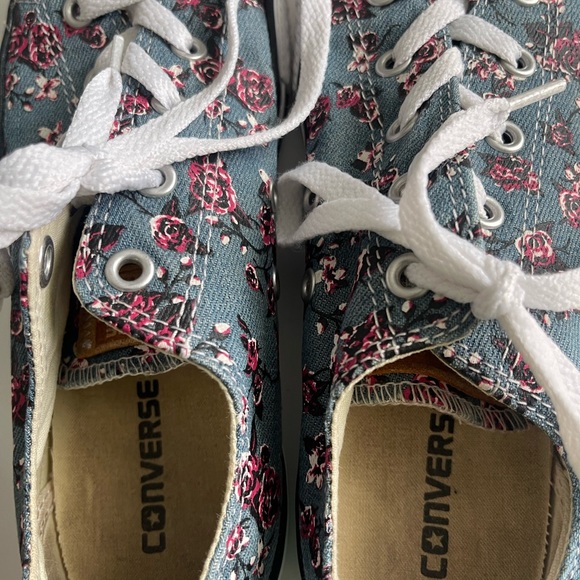 Converse All Star, Canvas, Vintage Floral print sneakers, lightly padded, Sz 3 Youth, Normal wear. Color is blue/gray with red floral print.