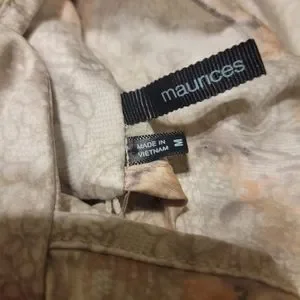 This is a peach and cream colored ruffle sleeveless top. This top was worn with the peace skirt. It a really cute top. It can be dressed up or with jeans. It is a silky type material.
