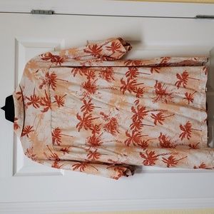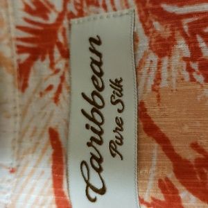 This is a Men's Caribbean Silk Tropical Shirt. It's off white / cream with coral & melon colors in the design.
