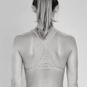 Mesh fixed triangle top with racerback and keyhole detail on back.