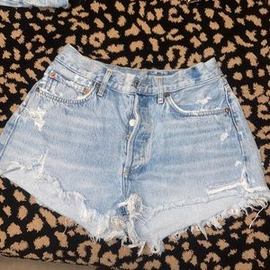 Agolde light wash denim shorts WITH ALTERATIONS. Great for someone with a larger bottom and small waist. They were way too baggy originally around the waist. Fits size 4 perfectly. See rip that came from factory. Too short for my current preferences. Paid $20 for alterations at the waist.