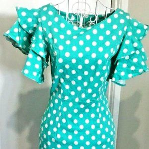 Ladies Dress Aqua White Polka Dot ROCKABILLY Sz 8-10 VGUC Cap Sleeves