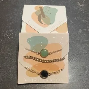 This sophisticated gold-plated layering set included a dainty link bracelet with turquoise charm, link bracelet with round black charm and a thick link bracelet.