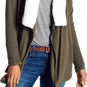 SUSINA Olive Green Faux Fur Sherpa Trimmed Collar Draped Open Front Long Sleeve Cardigan Sweater. Tag size XXS (Petite). Fits true to size. Excellent like-new condition with no flaws.