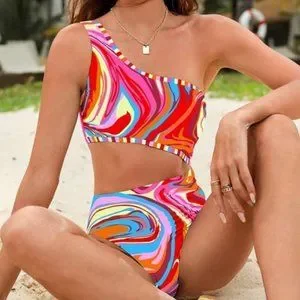 one shoulder funky allover print one piece swimsuit