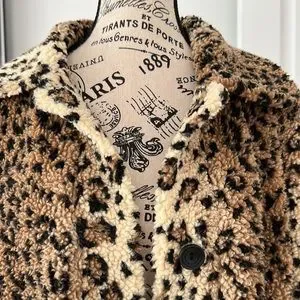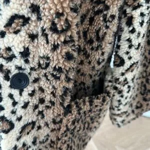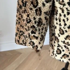 The Brixton Bern Coat is a relaxed-fit coat made in 100% polyester yarn-dyed leopard Sherpa. It features a drop shoulder fit, oversized patch pockets, satin lining, and woven Brixton labels. Last two photos are stock photos.
