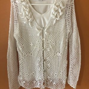 White cotton crochet sweater with buttons down the front and embellished v neck. Camisole included to wear underneath. Dressy summer top.