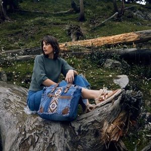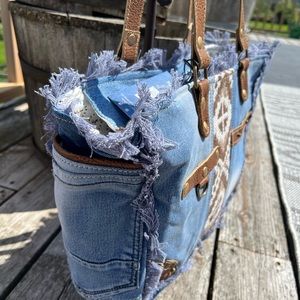 Retro Denim 90s Vibe Tribal Myra Bag Rug & Leather Tote satchel Aztec New
