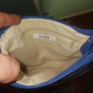 This is a Like New Without Tags blue Nine West purse that is in excellent condition. There is no signs of wear on any seams, corners, stitching, or strap. The zippers run perfectly and there is no visible staining or discoloration inside of any pockets of the purse.
