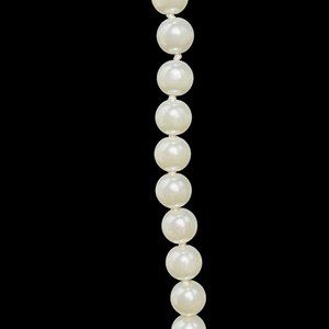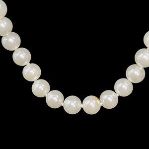 Single Strand Faux Pearl Necklace. There are knots between each pearl. It does not have any hallmarks on it.