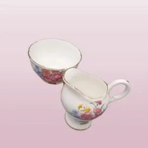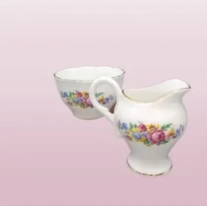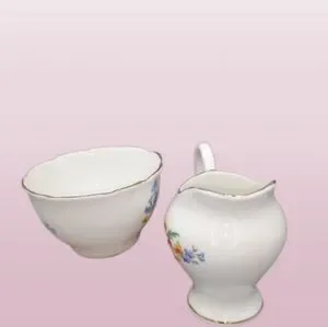 Royal Stuart, by Spencer Stevenson demitasse sugar bowl and creamer set, featuring a sweet floral design of roses, daisies, and cornflowers, and gilt trim