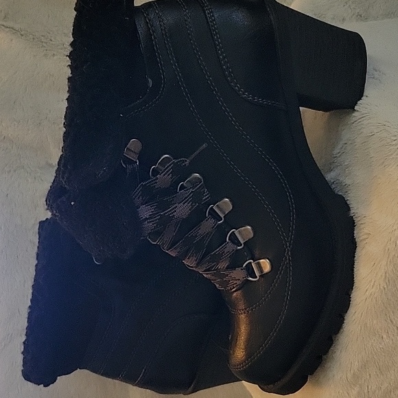 Jellypop black boots with faux fur around the top and tongue. Black & gray laces from the toe to the top with a 3 inch heel. These boots are in great condition, only worn 2 or 3 times.