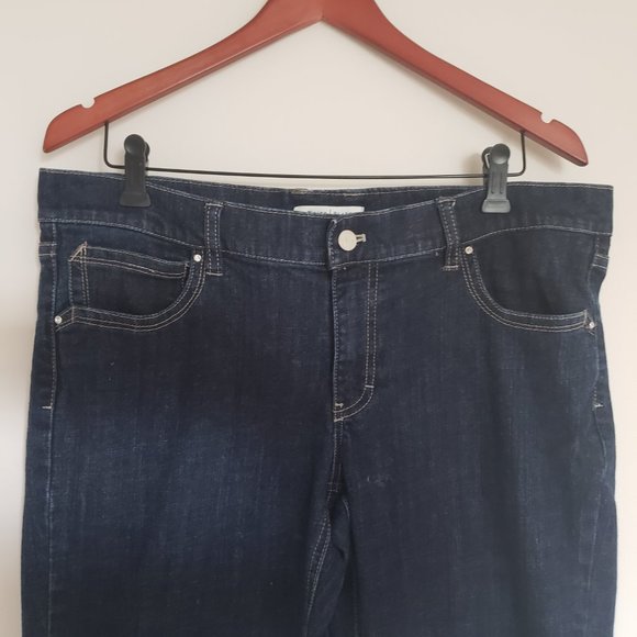 White House Black Market Noir Size 14 Dip Dye Capris, 99% Cotton and 1% Spandex. Two front and 2 rear pockets, each pocket has two jewel embellishments on pocket seam. Size 14, length 32", inseam 22 1/2" and waist laying flat is 18". I have pictured the fabric on the front where there is more white color in the denim, it looks like a faint spot but it is just the way the fabric is. Very good used condition.