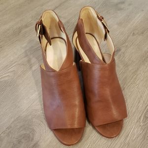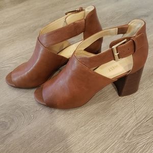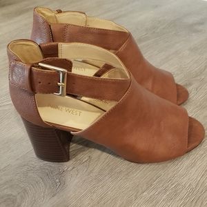 Pre owned in great condition these are peep toed chunky heels from the brand nine west in the color brown. This model shoes is: Gaceo and is in size 8. There is normal wear to the bottom of the shoe.