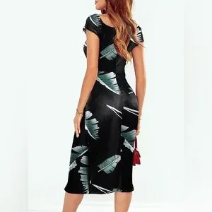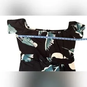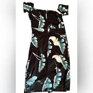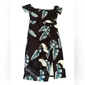 Womens Casual Shoulder black Floral tropical Print Ruched High Slit stretchy bodycon Dress. Hidden back zipper. Size 2X. NWOT.