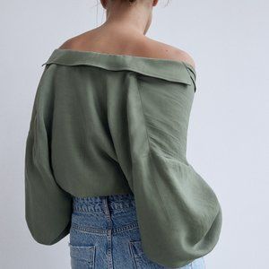 Elastic waist band and bell sleeves. Collared neckline with deep v-neck. Sage Green in Large.