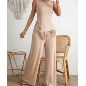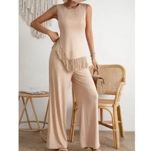 Apricot Boho Womens Fringe Hem Tank Top & Wide Leg Pants