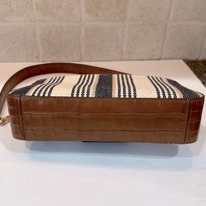 Cute Michael Kors Sage medium blue striped canvas shoulder bag with a chain-trimmed strap and crocodile-embossed accents. The Sage shoulder bag is a chic choice for daily wear. Carry it from 9-5 to after hours with ease.