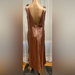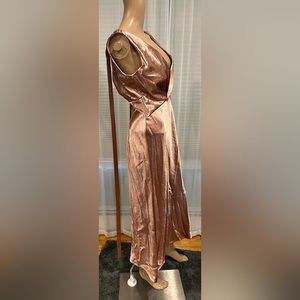 This decadent cocktail dress shimmers in the light with a high lustrous finish, featuring draped straps at the shoulders for an elongated silhouette.