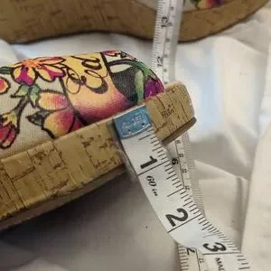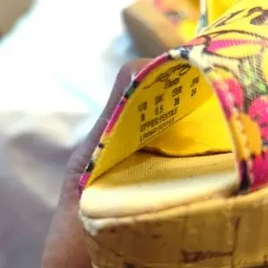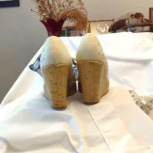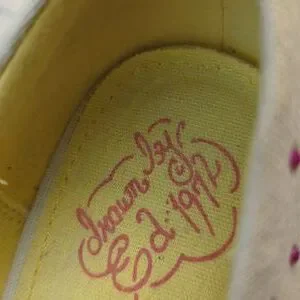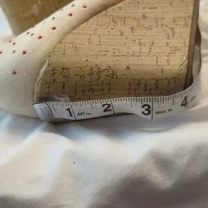 These shoes by Ed Hardy have the word Ed Hardy scrolled across the front of the shoe. The front of the shoe has a pit tub and the measurement for the heels 4 inches. The base color of the shoe is a off-white light light tan light tan. Ed Hardy is on the inside of the shoe where it is yellow and also you see Ed Hardy on the shoe sizing information. These shoes are a size 8 and they are in excellent condition.