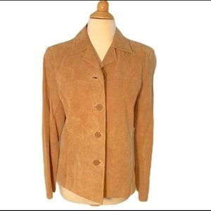Like new tan suede blazer/jacket, fully lined, in excellent condition! This jacket goes great with jeans, skirt and boots or work pants! Shell is 100% leather. Lining is 100% polyester. The jacket has a slightly tailored look. You can see the seams clearly in last picture. There is a faint marking on back, possibly where suede fibers were pressed down. Hardly visible. Bust: 18” across front, Length:24”; Sleeve: 25”.