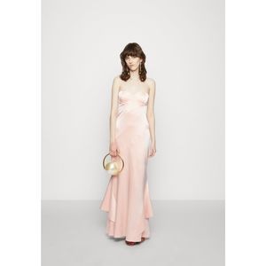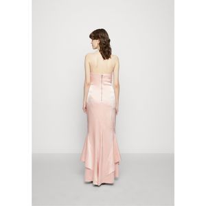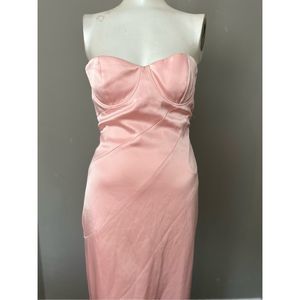 Designed with seamed shaping, this satin gown features ruffled sides and a flattering bustier neckline.