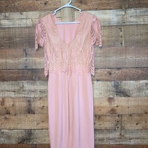 20’s couture, sheath, puff-shoulder scalloped-lace popover bodice and back-slit skirt. Hidden back zip closure, Bateau neck, Short cap sleeves, V-back