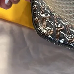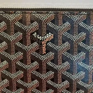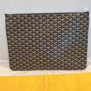 Authentic Goyard Senat GM portfolio/document case. Goyardine chevron printed canvas, done in the House's most favorable colorway of black, cream, and tan. Top zipped. Piped in black leather; matching black zipper tape; all silver hardware; signature Goyard zipper pull. Inside lined in yellow, and boasts a black leather business card holder at top. No wear to canvas, corners or piping. Bag is not misshapen, lays flat, has no folds, wrinkles or stretched areas. Inside clean with no stains or odor. PRISTINE CONDITION THROUGHOUT. This is the ultimate carrying piece for all your documents. Includes Goyard dust bag. Guaranteed authentic. #1438783270R.