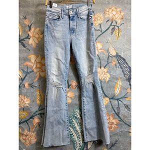 A must for any weekend wardrobe, these no-fuss MOTHER flare jeans feature a high rise, heavy fading, and the brand's always-comfortable stretch denim. A raw hem and shredded holes at the knees add to the well-loved feel of this pair.