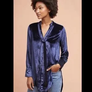 Anthropologie Mauve blue Tie Neck Button Down Hi Lo Tunic Top